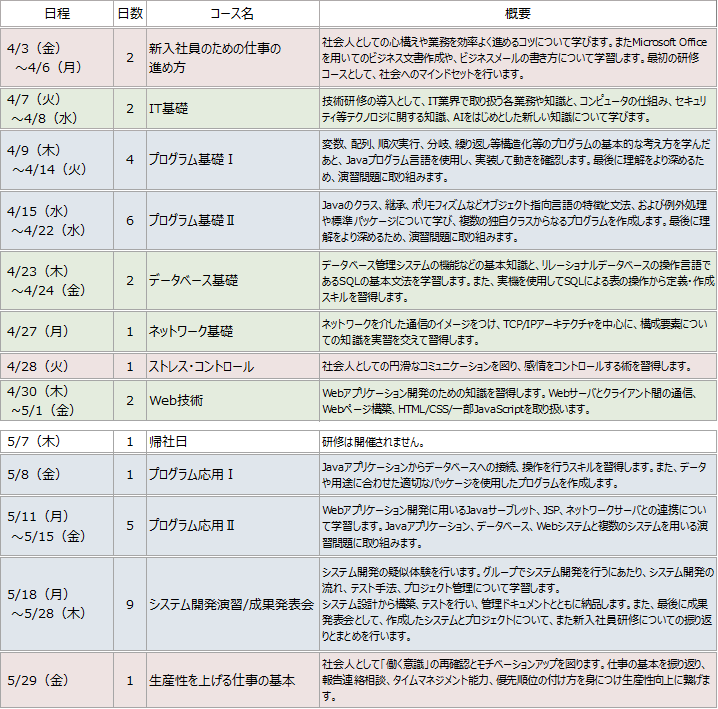 システム開発演習/成果発表会 | システム開発の疑似体験を行います。グループでシステム開発を行うにあたり、システム開発の流れ、テスト手法、プロジェクト管理について学習します。システム設計から構築、テストを行い、管理ドキュメントとともに納品します。また、最後に成果発表会として、作成したシステムとプロジェクトについて、また新入社員研修についての振り返りとまとめを行います。 |